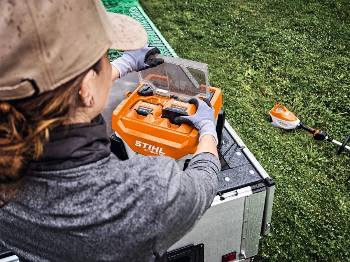 Oltre al breve tempo di ricarica, altri vantaggi di STIHL AL 1802 MO includono il raffreddamento attivo delle batterie durante la ricarica, il trasporto sicuro delle batterie e la ricarica durante la guida