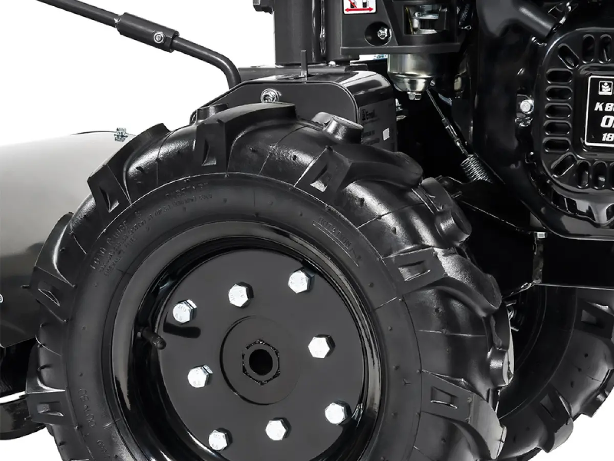 - Le ruote di grandi dimensioni e le stegole regolabili, sia in altezza che lateralmente, tramite una comoda leva, garantiscono all’operatore il massimo controllo del motocoltivatore, consentendo di adattarlo ai diversi contesti di utilizzo