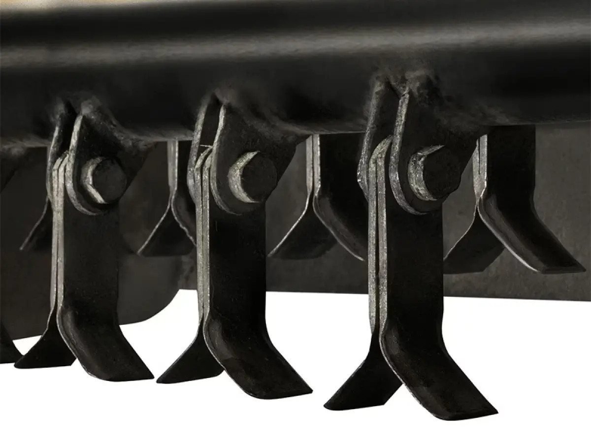 - Il rotore da 100 cm con 58 coltelli a “Y” assicura una trinciatura uniforme e veloce anche su vegetazione fitta e ostinata
