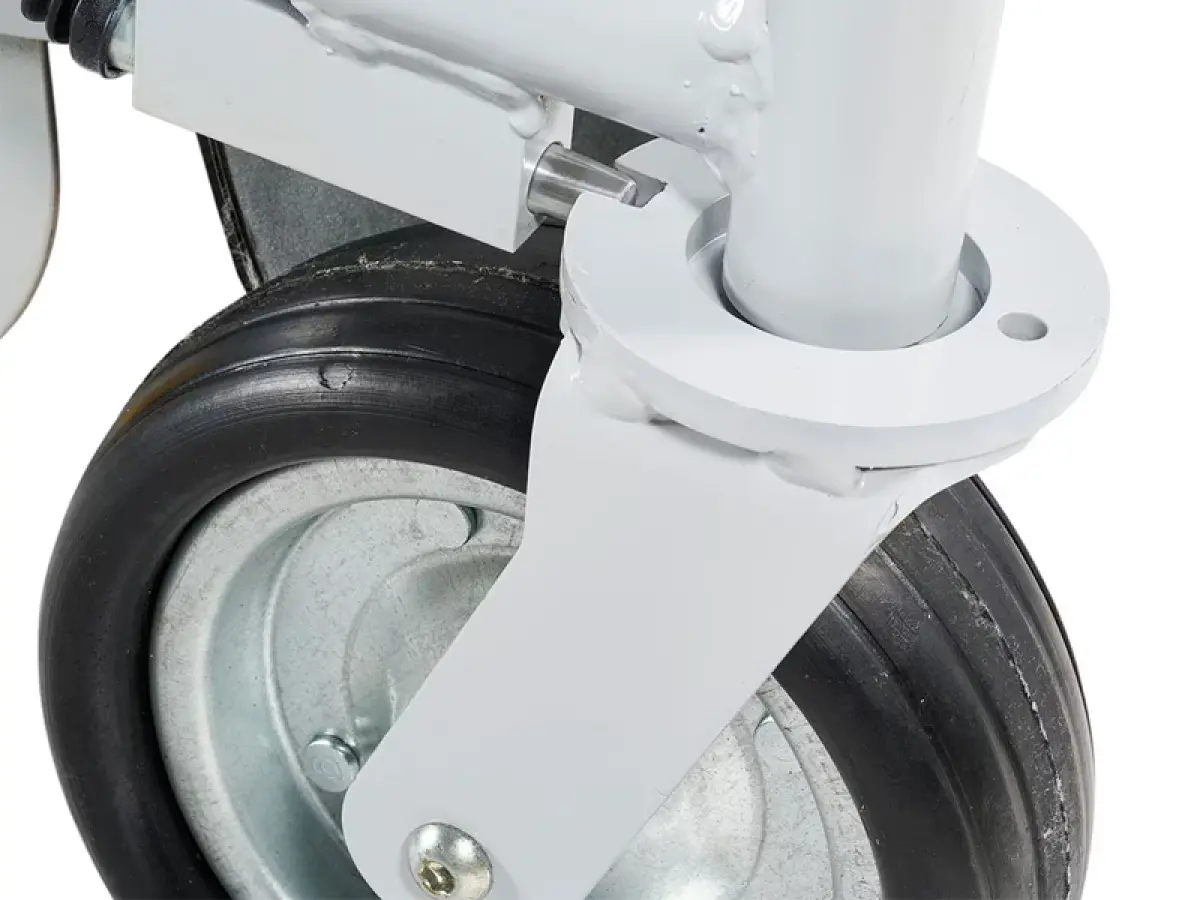 - Le ruote anteriori pivotanti con bloccaggio e il freno di servizio a inserimento automatico garantiscono stabilità e sicurezza, mentre il design compatto e ben bilanciato consente manovre rapide e semplici