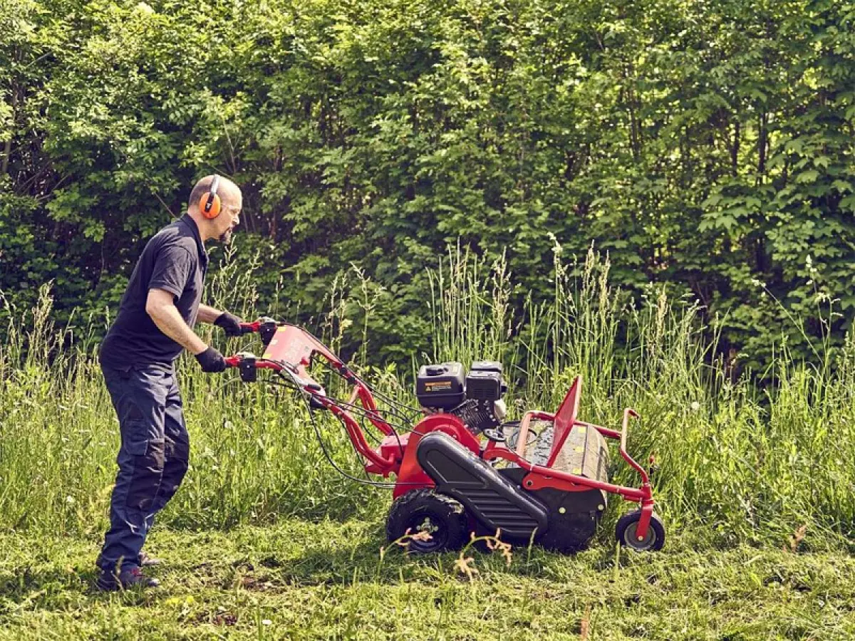 - L'ampiezza di taglio del trincia è pari a 75 cm, mentre l'altezza di taglio è regolabile dai 2 agli 8 cm. Grazie al sistema di taglio con rotore con 40 coltelli è possibile distruggere masse di ogni tipo di erba infestante di vario diametro, altezza e dimensione