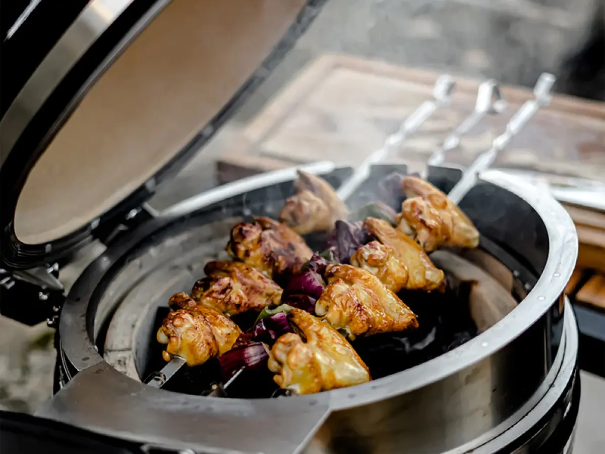 - Ciò significa che puoi preparare facilmente pollame, cosce di agnello o shish kebab di verdure con tutti i vantaggi della griglia in ceramica