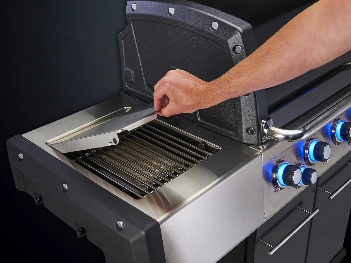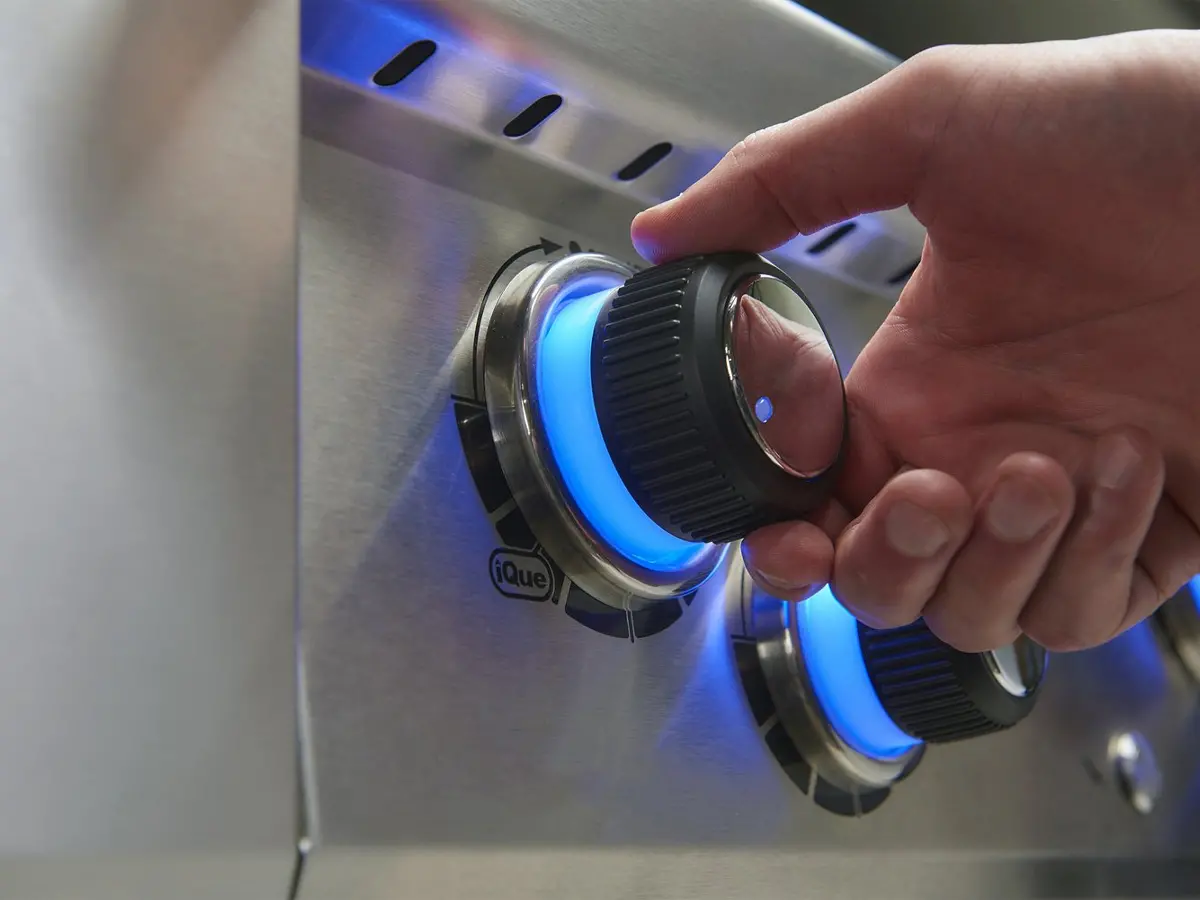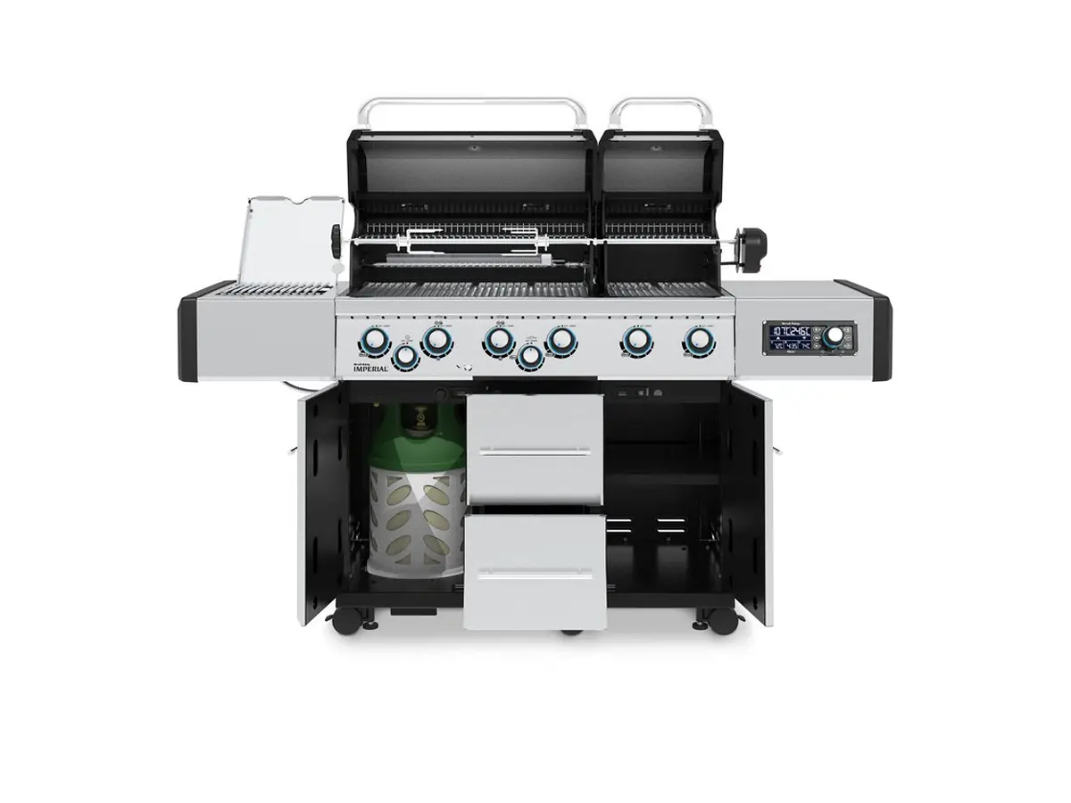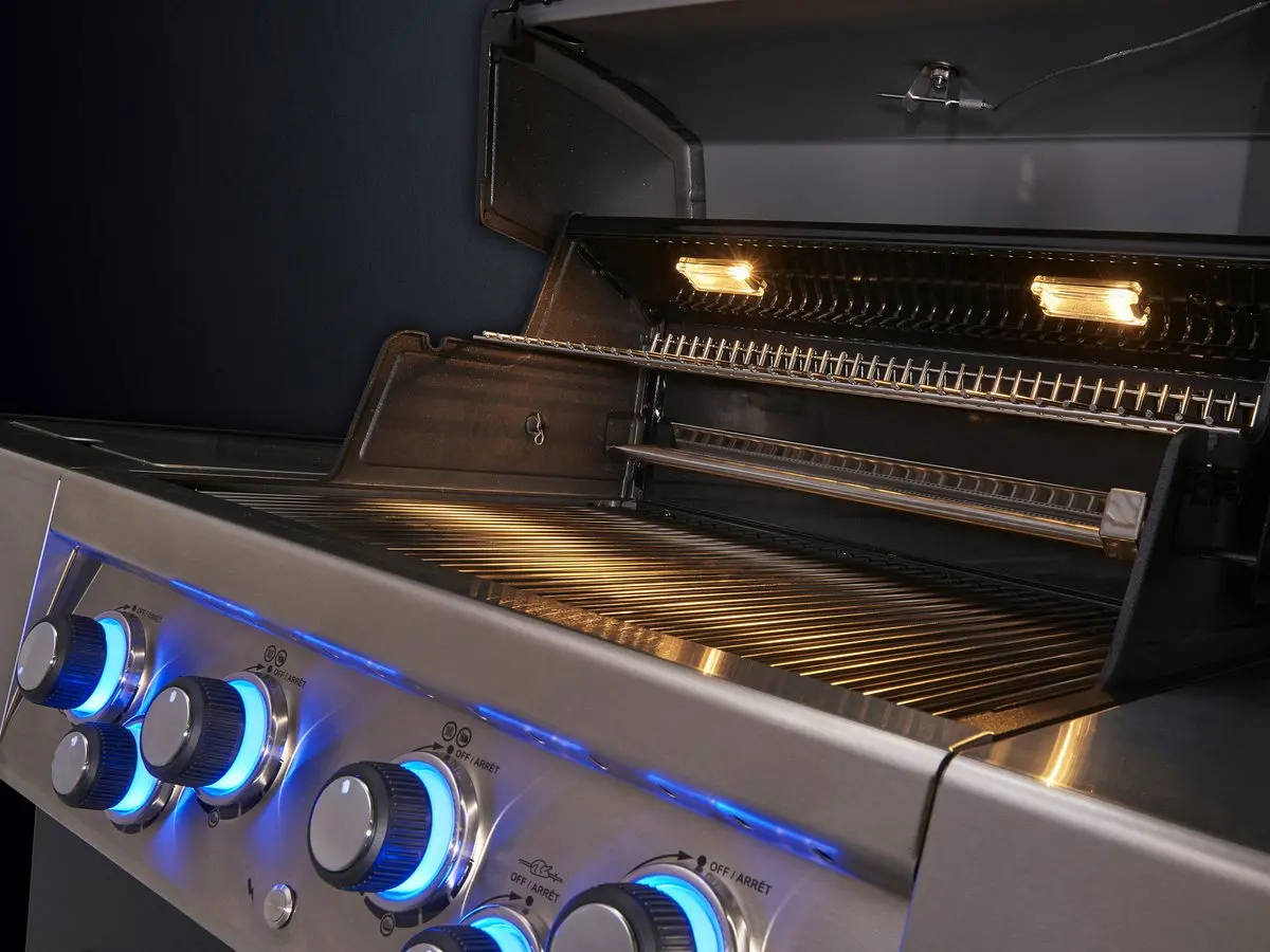 - Con girarrosto, bruciatore posteriore, fornello laterale, luci interne e manopole illuminate a LED