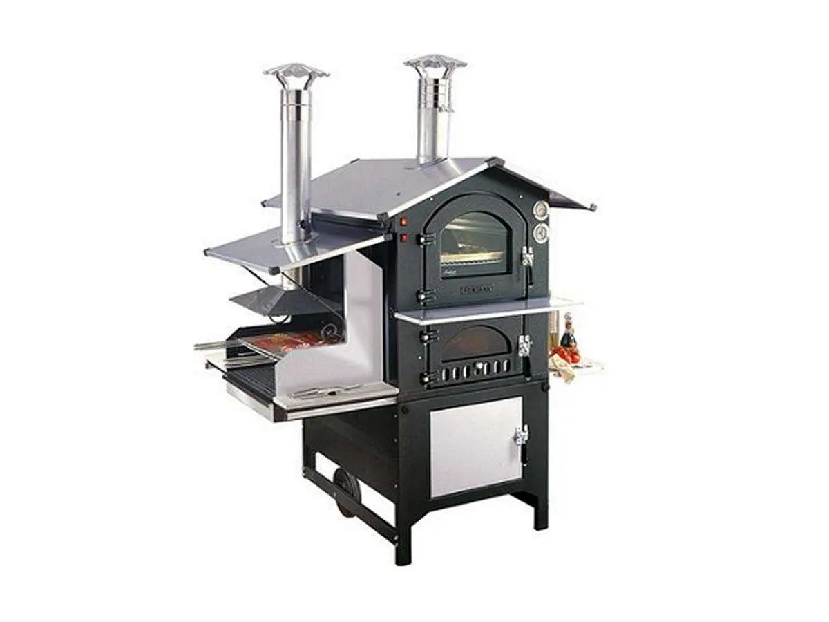 - Fornito con 1 piastra refrattaria, 3 padelloni per alimenti (2 x su 57), 3 griglie cromate, 1 piano appoggio anteriore inox, 1 piano appoggio laterale inox, 1 tirantino, 1 comignolo, 1 display digitale, 2 sonde carne