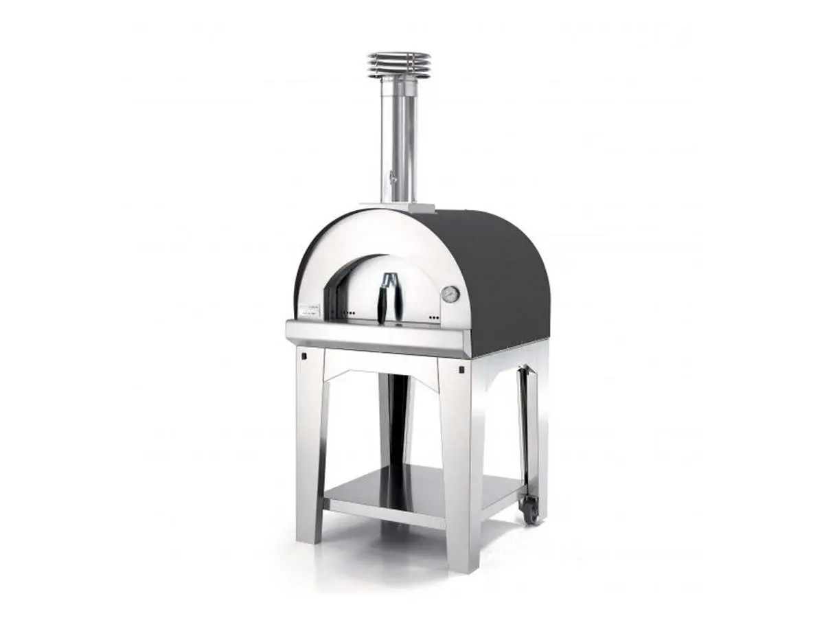 - Forno con camera di cottura da 60×60 cm. Dotato di ruote e gancio porta utensili è fornito di canna fumaria dotata di valvola di regolazione dei fumi e cappello, porta di chiusura della bocca fuoco