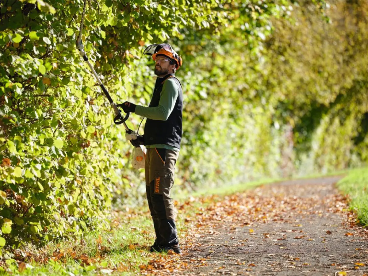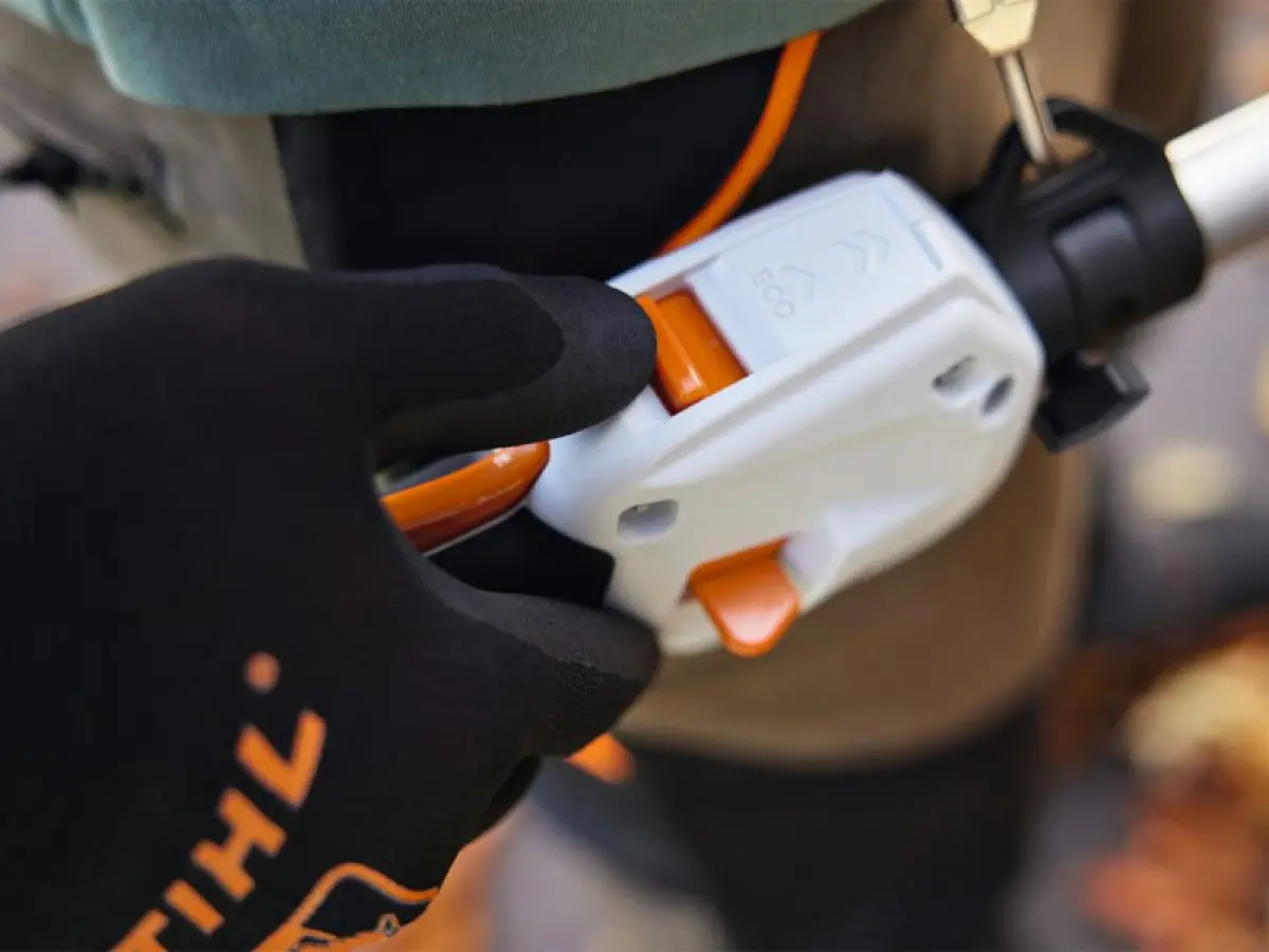 - A seconda dell'applicazione, puoi anche regolare la velocità in modo continuo. Durante i lavori prolungati, il peso ridotto del STIHL KMA 120 R ti supporta per un lavoro confortevole. Puoi agganciare una tracolla doppia opzionale all'occhiello rotante se desideri lavorare comodamente per lunghi periodi