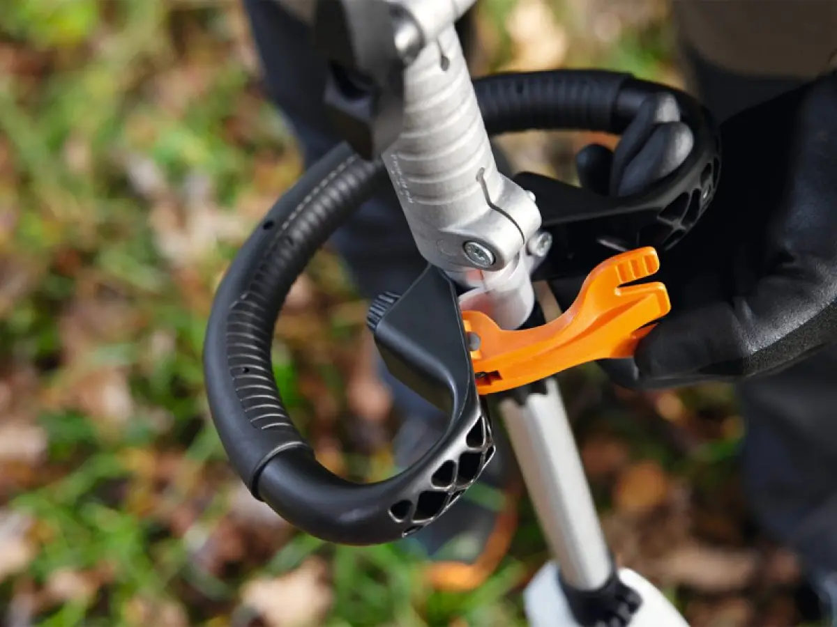 - Grazie all'impugnatura circolare, hai la massima flessibilità durante il lavoro, ad esempio tra alberi e arbusti o in altre aree ristrette. Per una postura di lavoro ergonomica, puoi regolare rapidamente e senza attrezzi l'impugnatura alla tua altezza grazie al sistema di regolazione rapida