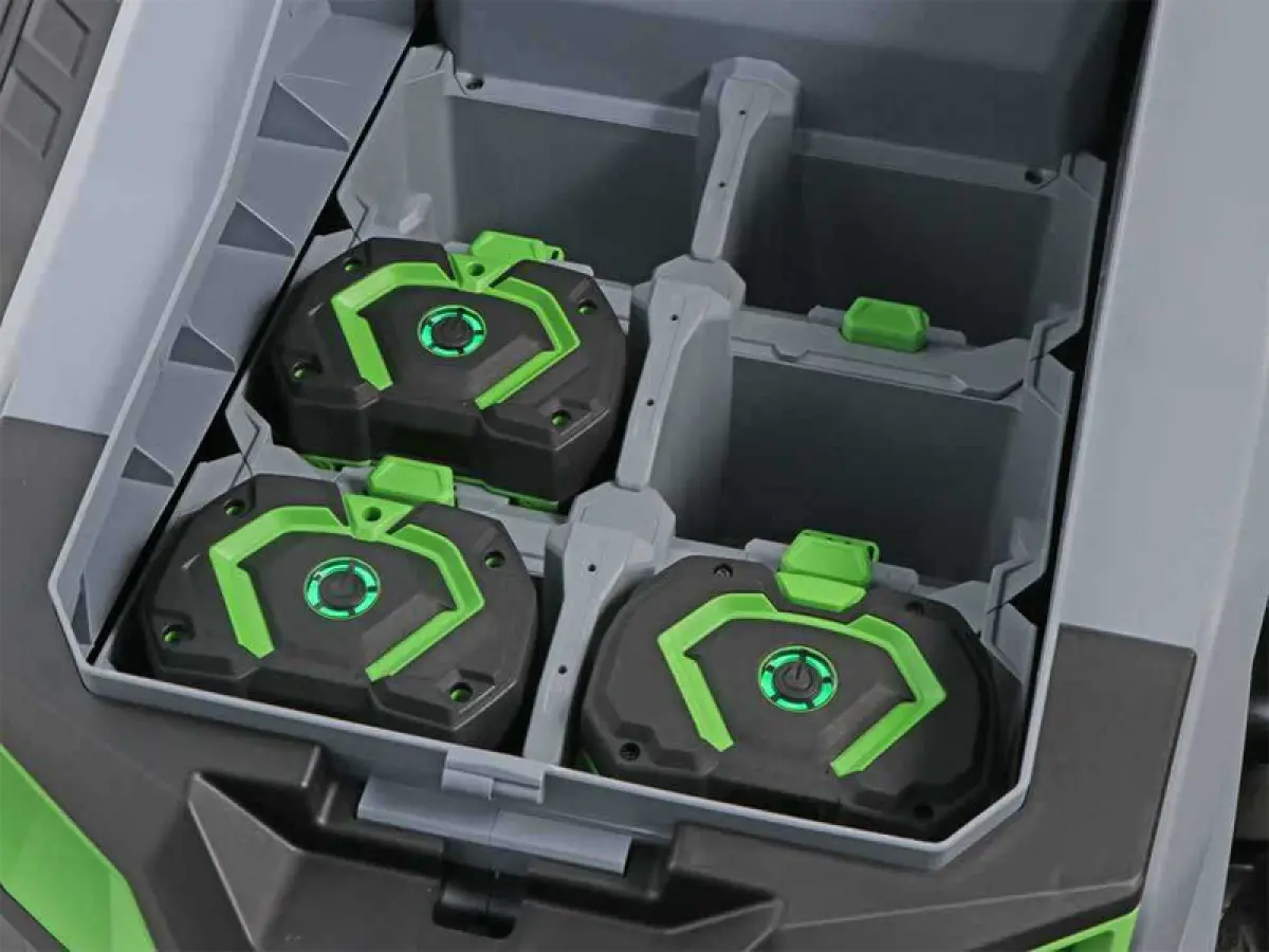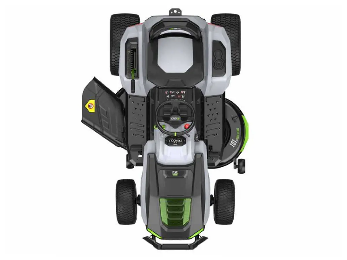 - Il kit trattore EGO con scarico laterale, completo di tappo per pacciamatura e caricabatterie da 1600 W, consente di tagliare più velocemente livelli di erba più alti, poiché non è necessaria la raccolta dell'erba