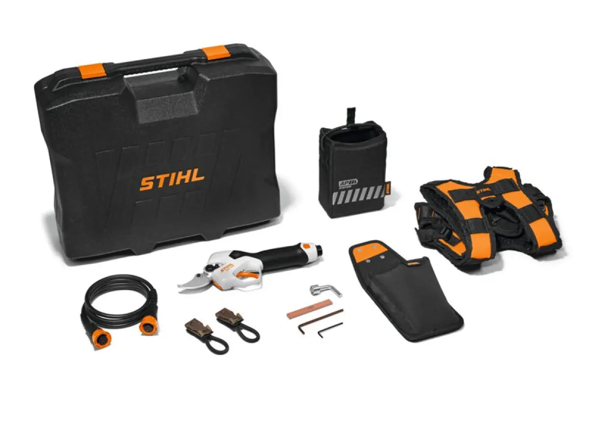 - La dotazione comprende, oltre alla STIHL ASA 140, un sistema di trasporto con fondina, una borsa per la batteria con cavo di collegamento e guida cavo ADVANCE X-Flex, una pietra per affilare, gli attrezzi per la manutenzione e una valigetta robusta con inserto estraibile e rete portaoggetti