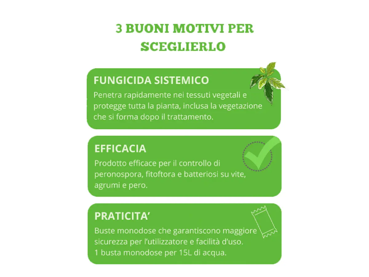 - Fungicida sistemico ideale per la difesa della Phytophtora degli agrumi, della peronospora della vite e della batteriosi del pero